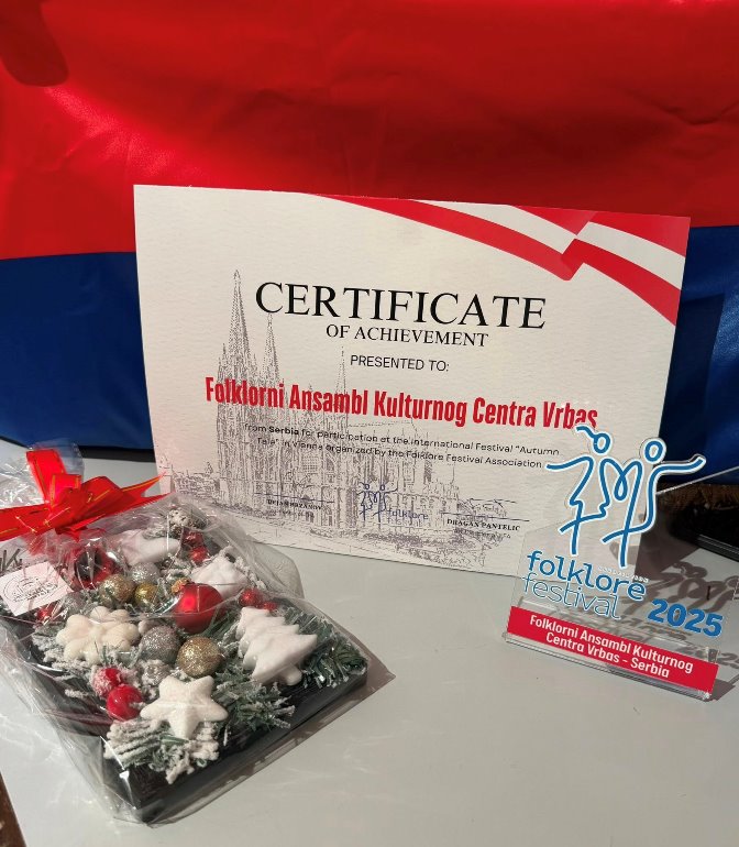 Фолклорни ансамбл Културног центра Врбаса успешно је представљао Србију на Међународном фестивалу игре и песама „Autumn Tale“, који је одржан у Бечу, саопштено је из ове установе. "Фестивал у Бечу окупио је културно–уметничка друштва и плесне ансамбле из више земаља међу којима су Србија, Немачка, Украјина, Грчка, Хрватска, Босна и Херцеговина, Сингапур, Молдавија, Костарика и домаћин Аустрија. Овај реномирани фестивал, познат по промоцији традиције и културне разноликости, пружио је члановима ансамбла прилику да се представе публици и учесницима из различитих делова света.